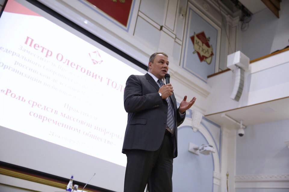 В Кутафинском зале МГЮА 24 октября 2017 года прошёл практикум Заместителя Председателя Государственной Думы РФ Петра Толстого на тему «Роль средств массовой информации в современном обществе».